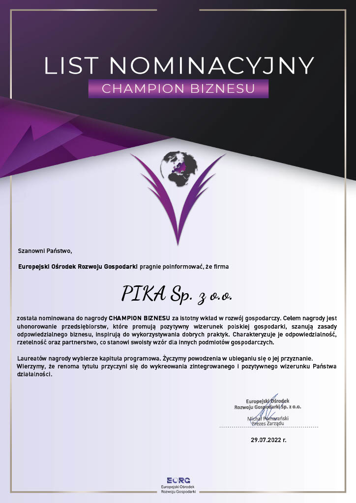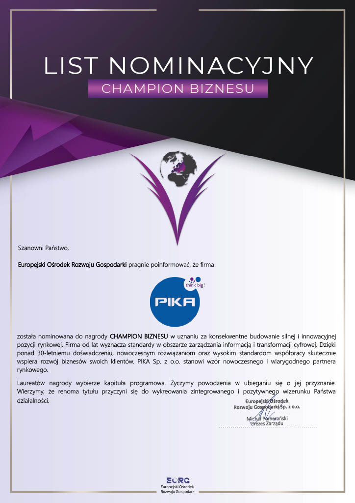 Do pozycji lidera i pioniera w procesie zarządzania informacją PIKA dochodziła przez 30 lat. Dziś jest potentatem i z sukcesem konkuruje z globalnymi graczami na polskim rynku. Jesteśmy doceniani i wyróżniani. Pozycję firmy potwierdzają liczne nagrody i wyróżnienia, w tym „Gazele Biznesu” przyznawane wielokrotnie przez „Puls Biznesu”, „Gryf Gospodarczy”, Medal Najwyższej Jakości Quality International oraz tytuł „Przedsiębiorstwo Fair Play”.